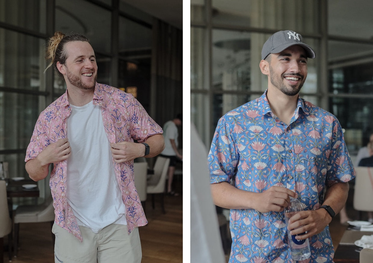 Our team packed shirts for the entire squad, each accompanied by a personal note. Arriving at the hotel at 10:00 a.m., we were warmly welcomed by Dave, who introduced us to John, a journalist and team member. The players arrived one by one, trying on our shirts and absolutely loving them. Logan, in particular, was a bundle of energy, striking poses and chatting with us about their lives and our journey. He even picked out a waistcoat to complete his Indian look!